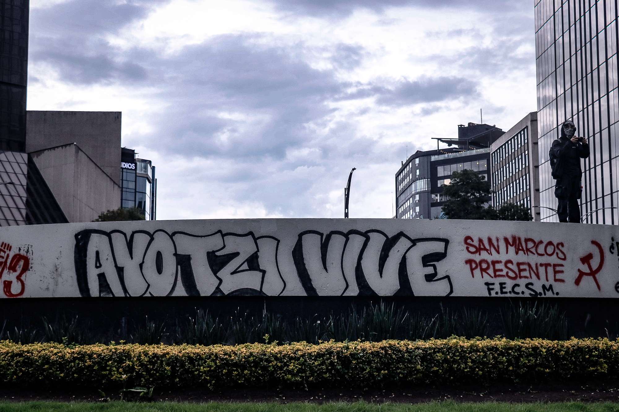El antimonumento que recuerda a los 43 estudiantes desaparecidos en 2014 fue uno de los puntos de encuentro. Este fue colocado en 2015 en el Paseo de Lla Reforma como un reclamo al Gobierno de Enrique Peña Nieto. Foto: Lizbeth Hernández.