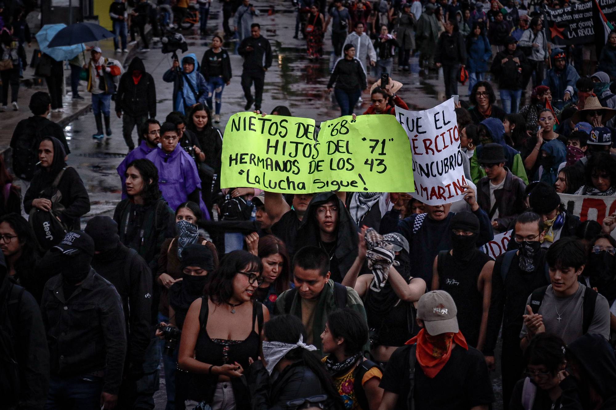 Las masacres de 1968 y 1971 contra estudiantes universitarios en la Ciudad de México, fueron recordadas en las consignas de la marcha en memoria a los normalistas de Ayotzinapa. Foto: Lizbeth Hernández.