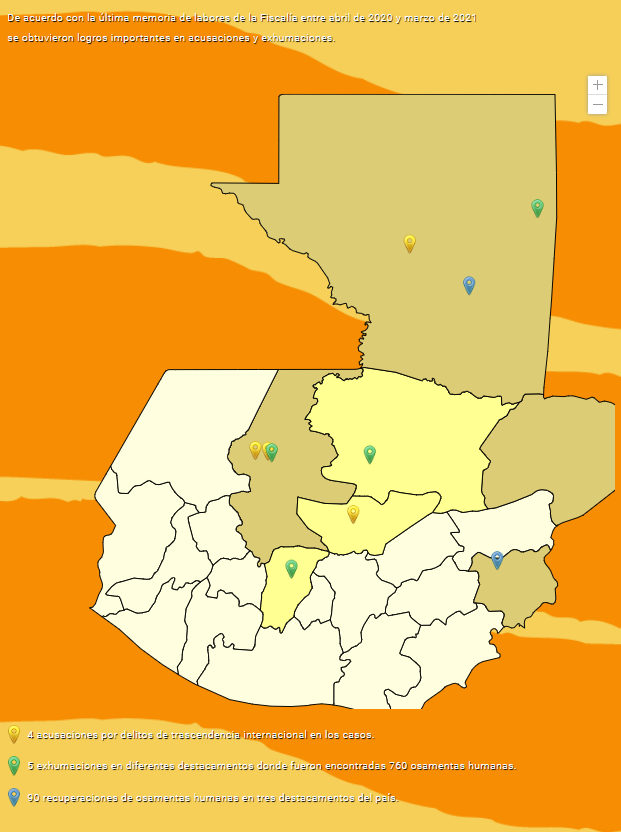 Entre 2019 y 2020, la agencia de Casos Especiales del Conflicto Armado Interno, logró 5 órdenes de aprehensión, 2 acusaciones (una en el caso de genocidio Ixil y una en el caso de violencia sexual en la región Achí), 13 anticipos de prueba con declaraciones testimoniales y 3 exhumaciones, estos son algunos datos que reflejan la acuciosidad del equipo.