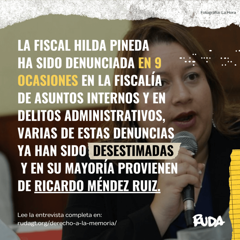 La mujer que dirigió la fiscalía será recordada por su entereza y su ética. Su nombre es Hilda Pineda y trabajaba desde hace una década en la fiscalía de Derechos Humanos del Ministerio Público -MP-. El año pasado Consuelo Porras, máxima autoridad dentro de dicha instancia, decidió removerla del cargo, el 11 de octubre de 2021, según un comunicado oficial, “para el fortalecimiento de la institución”, Hilda Pineda sería trasladada a una nueva sección que investigará delitos contra turistas.