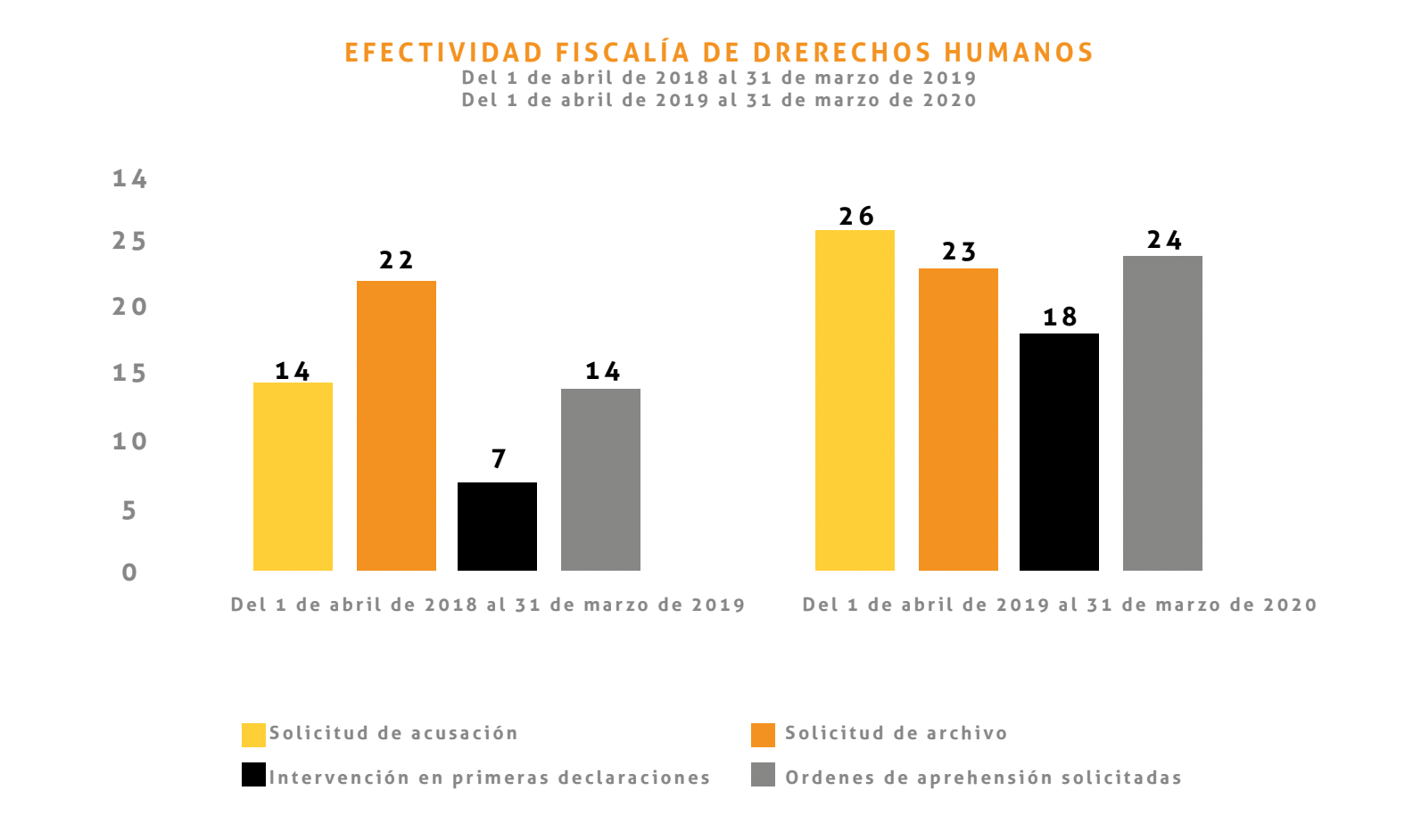 Las fiscalías de delitos contra periodistas y contra operadores de justicia y sindicalistas se independizaron el 6 y 10 de diciembre de 2019 respectivamente. En la fiscalía de DDHH, los resultados fueron visibles de manera continua, por ejemplo, en el año 2019, se incrementaron en 85.71% las solicitudes de acusación, lo que reflejaba el fortalecimiento de las investigaciones.