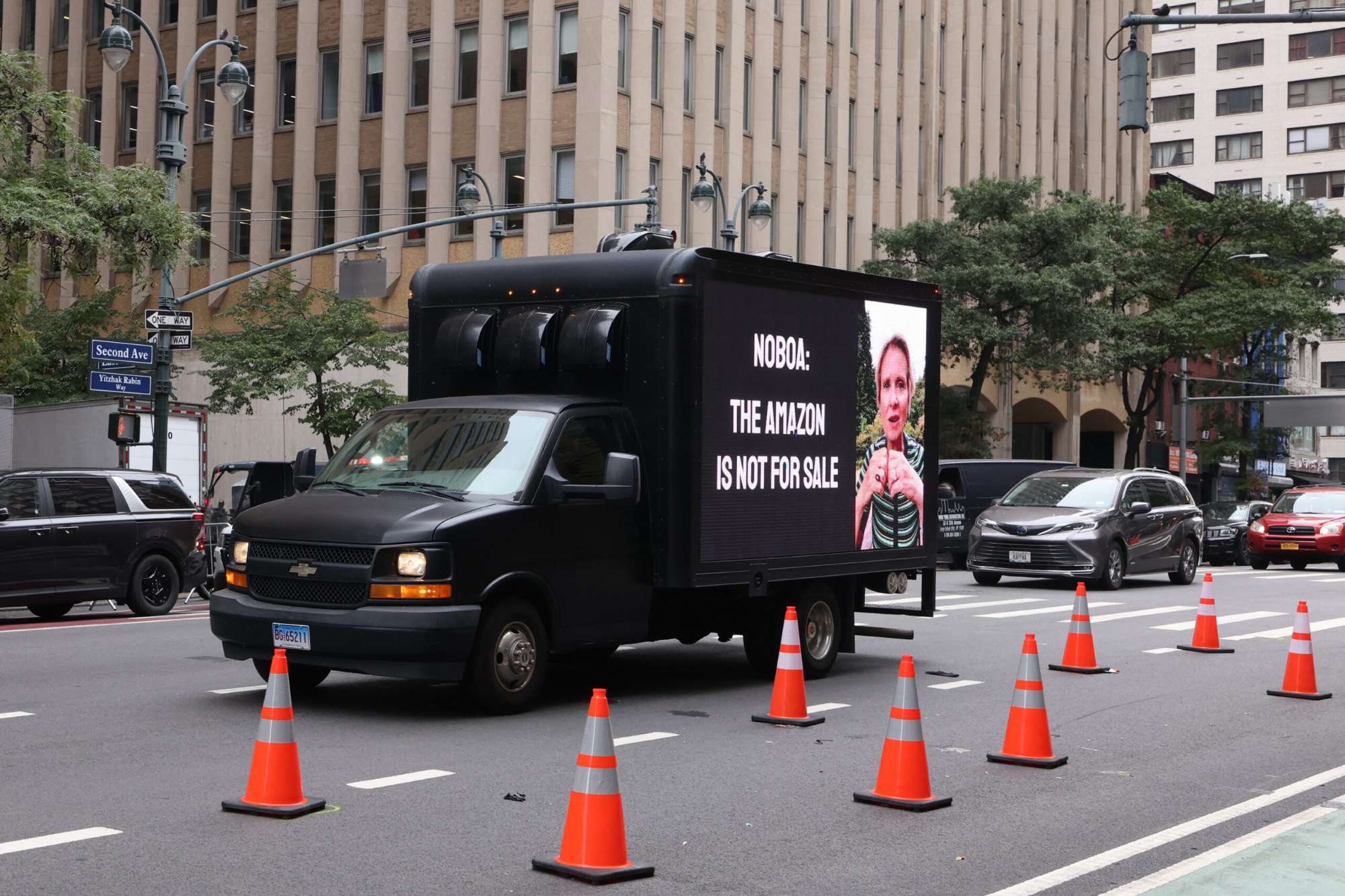 «Noboa: la Amazonía no está en venta», dice la actriz Cynthia Nixon en este video que recorrió las calles de Nueva York. Foto: cortesía Jason DeCrow / Amazon Frontlines
