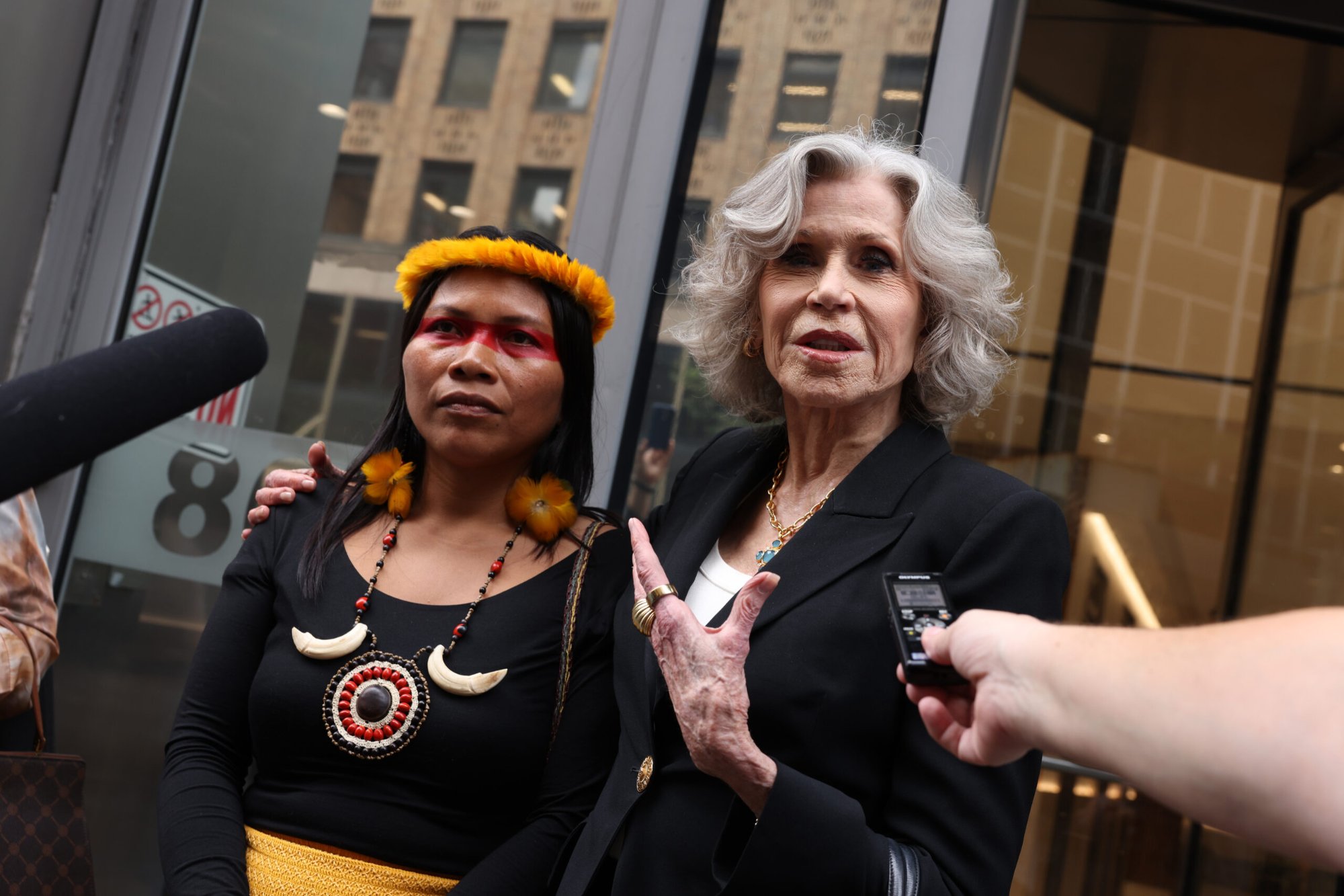 En Nueva York, la lideresa waorani Nemonte Nenquimo, junto a la actriz y activista Jane Fonda, denunció los planes de expansión petrolera del gobierno ecuatoriano. Foto: cortesía Jason DeCrow / Amazon Frontlines