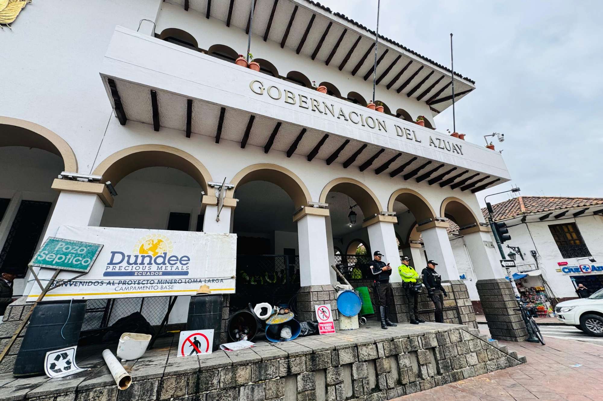 Manifestantes expusieron a los pies de la Gobernación del Azuay la basura que recogieron en la zona concesionada al proyecto minero Loma Larga. Foto: cortesía Marco Astudillo
