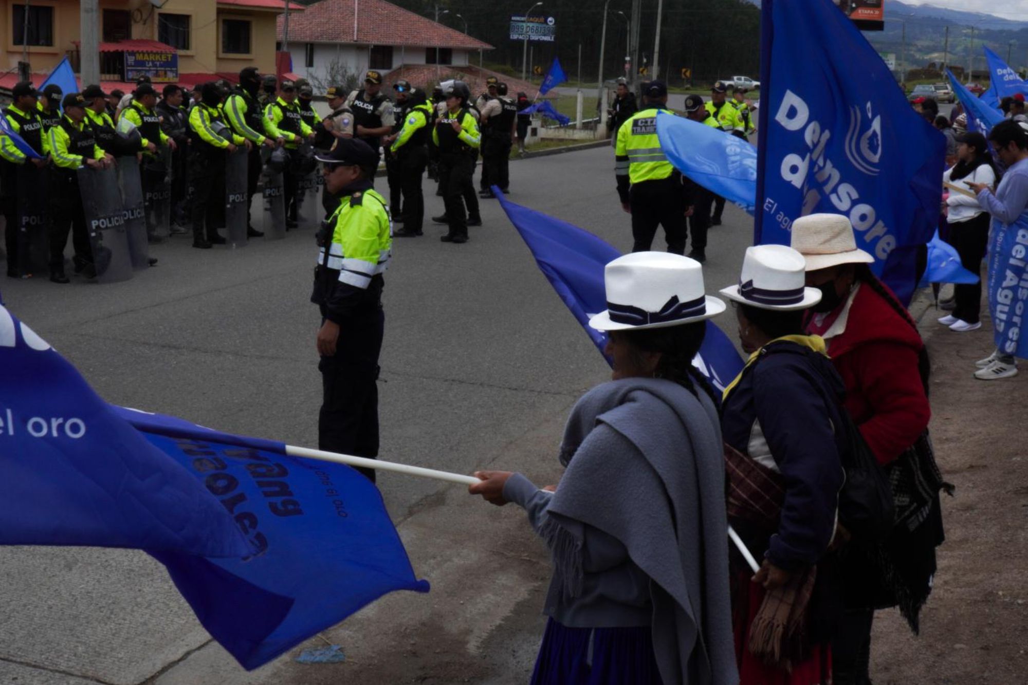 En Azuay, la Policía se mantuvo cerca de los manifestantes, autoidentificados como defensores del agua. Foto: cortesía FOA