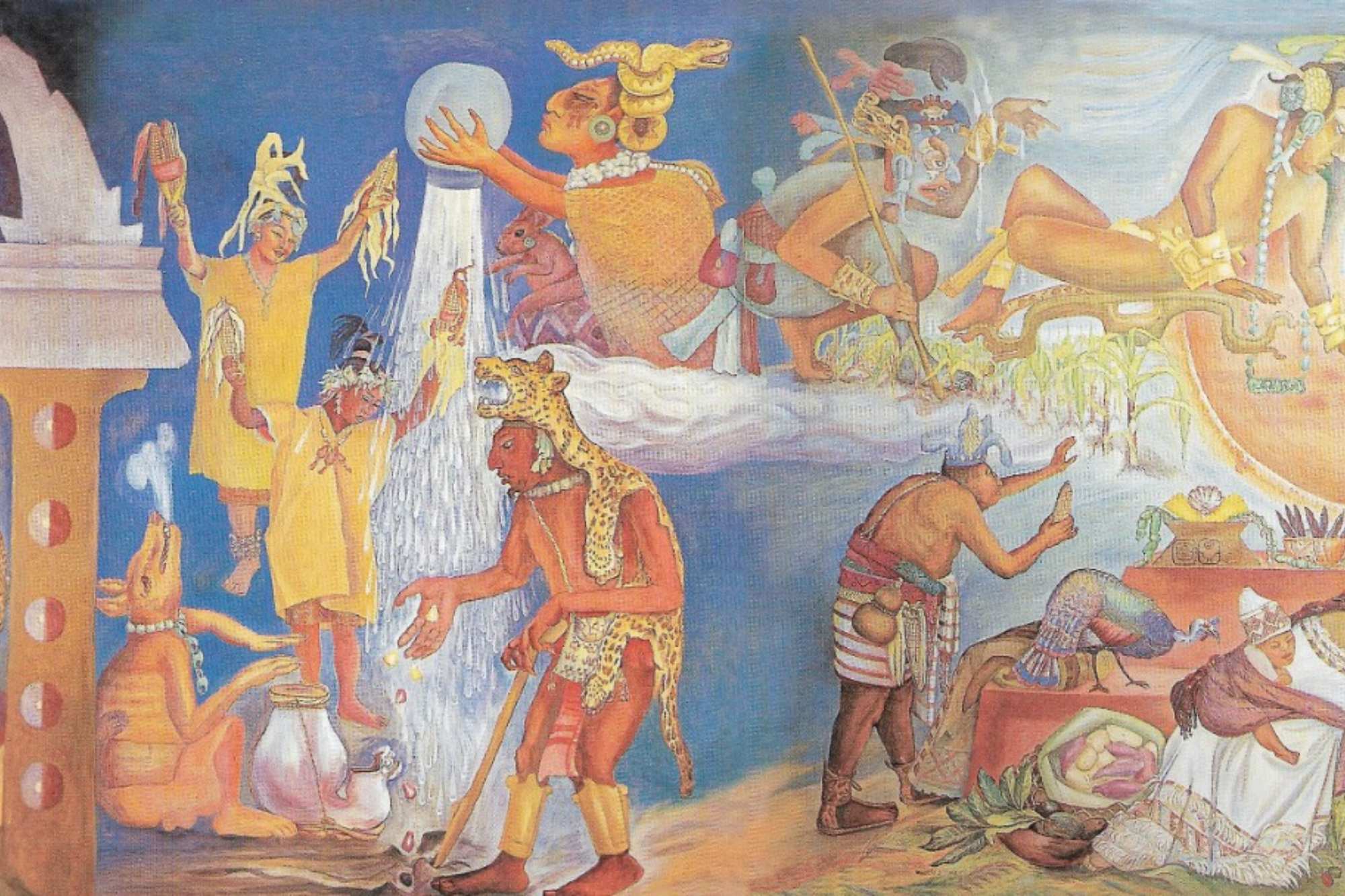 Fragmento de Venerable abuelo maíz, 1996, temple sobre lino, 2.70 x 19.00 m, Sala Maya del Museo de Antropología, México.