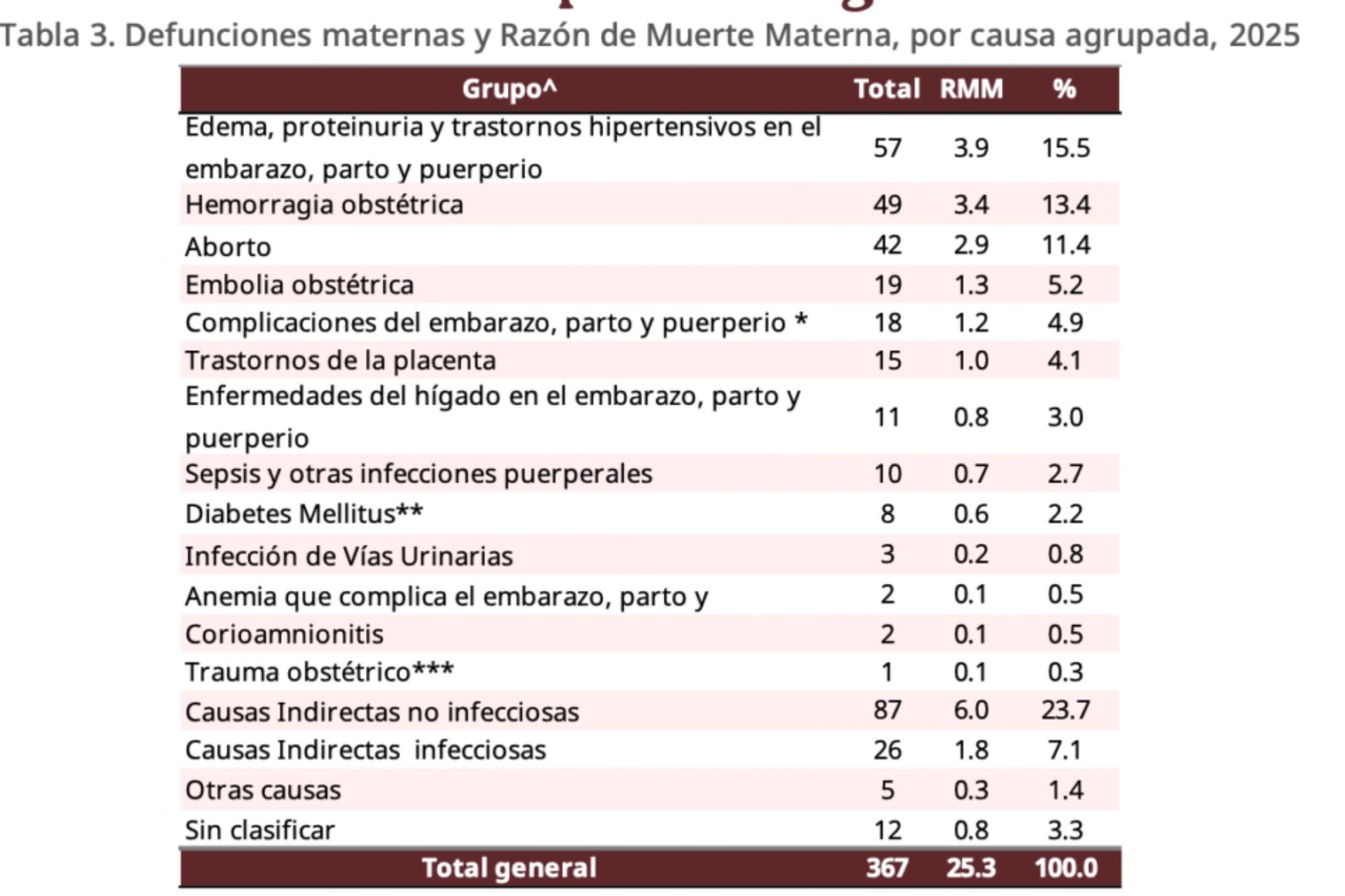 Según información de la Secretaría de Salud Pública, a través de sus Informes Semanales para la Vigilancia Epidemiológica de Muertes Maternas, indicó que hasta la semana epidemiológica 38 correspondiente a septiembre del 2025, las principales causas de defunción son: enfermedad hipertensiva, edema y proteinuria en el embarazo, el parto y el puerperio (15.5%); hemorragia obstétrica (13.4%); aborto (11.4%) y embolia obstétrica con el (5.2%).