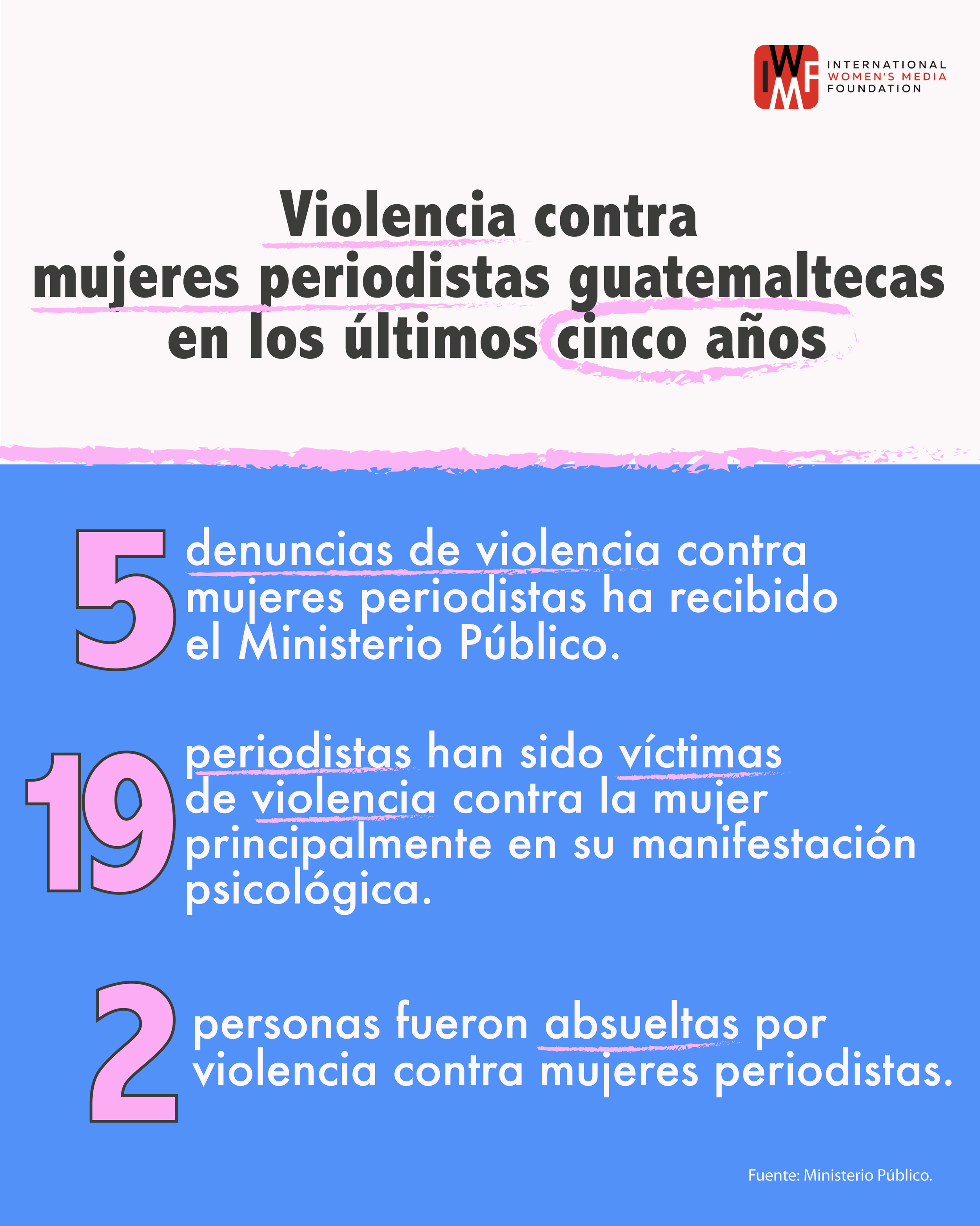 Para este reportaje se realizaron solicitudes de información pública al MP para obtener las estadísticas generales de las denuncias que han interpuesto las periodistas y se buscó a la Fiscalía de Delitos contra Periodistas para conocer el tratamiento que da a los casos.