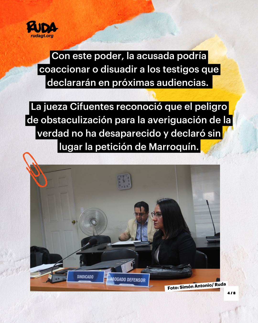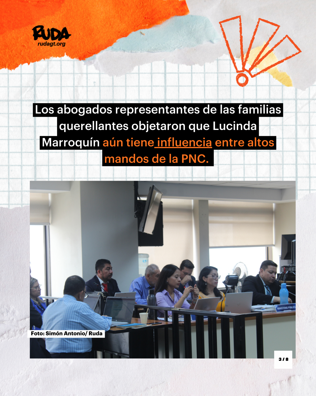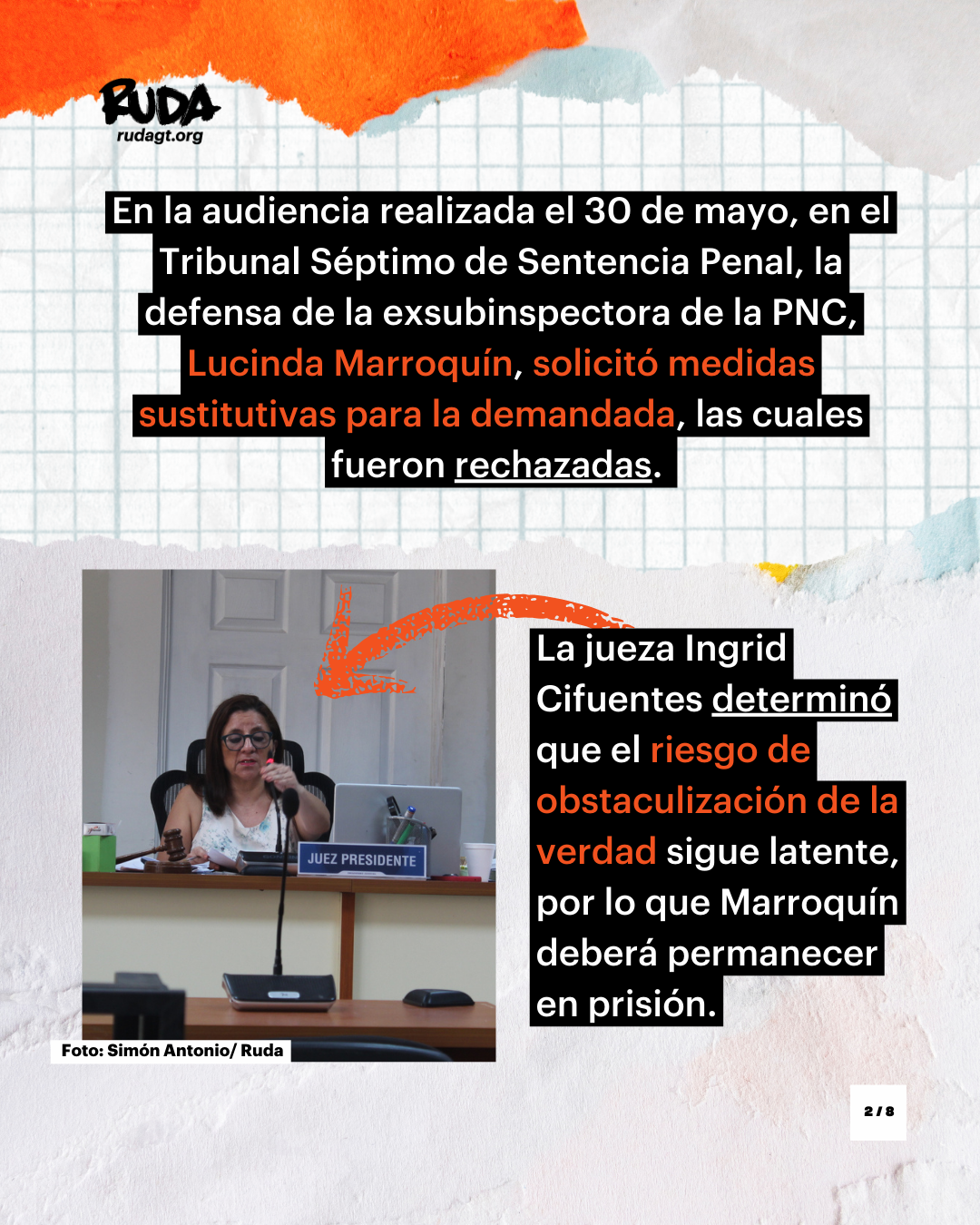 La jueza Ingrid Vanessa Cifuentes, presidenta del Tribunal Séptimo de Sentencia Penal, negó la solicitud de medidas sustitutivas a Lucinda Eva Marina Marroquín Carrillo, quien en 2017 fungía como subinspectora de la Policía Nacional Civil (PNC), por sospecha de obstaculización a la averiguación de la verdad. Marroquín Carrillo enfrenta un juicio por la masacre de niñas y adolescentes en el Hogar Seguro Virgen de la Asunción, el 8 de marzo de 2017.
