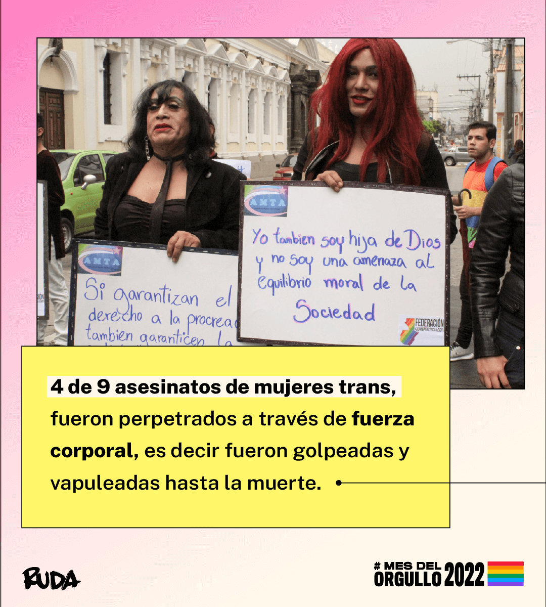 Para las mujeres trans, ser visibles se convierte en un factor de riesgo persistente en la sociedad guatemalteca debido a la transfobia. El 33% de las entrevistadas expresaron recibir agresiones en la calle y el 13% mencionaron que las agresiones se dieron en el lugar de trabajo, sin indicar si se referían a un trabajo formal o informal.