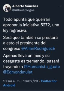 En la lista de quienes votaron a favor también aparece el diputado Alberto Sánchez, quien fue separado del partido Semilla y acusado recientemente de acoso. Este parlamentario dijo una vez que la iniciativa 5272 era ley regresiva, pero aún así votó esta vez aprobándola.