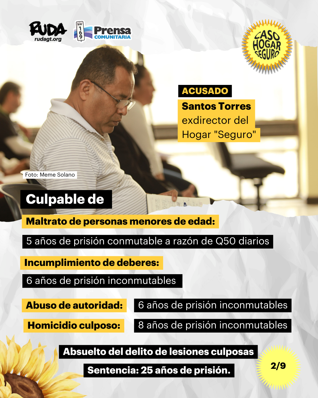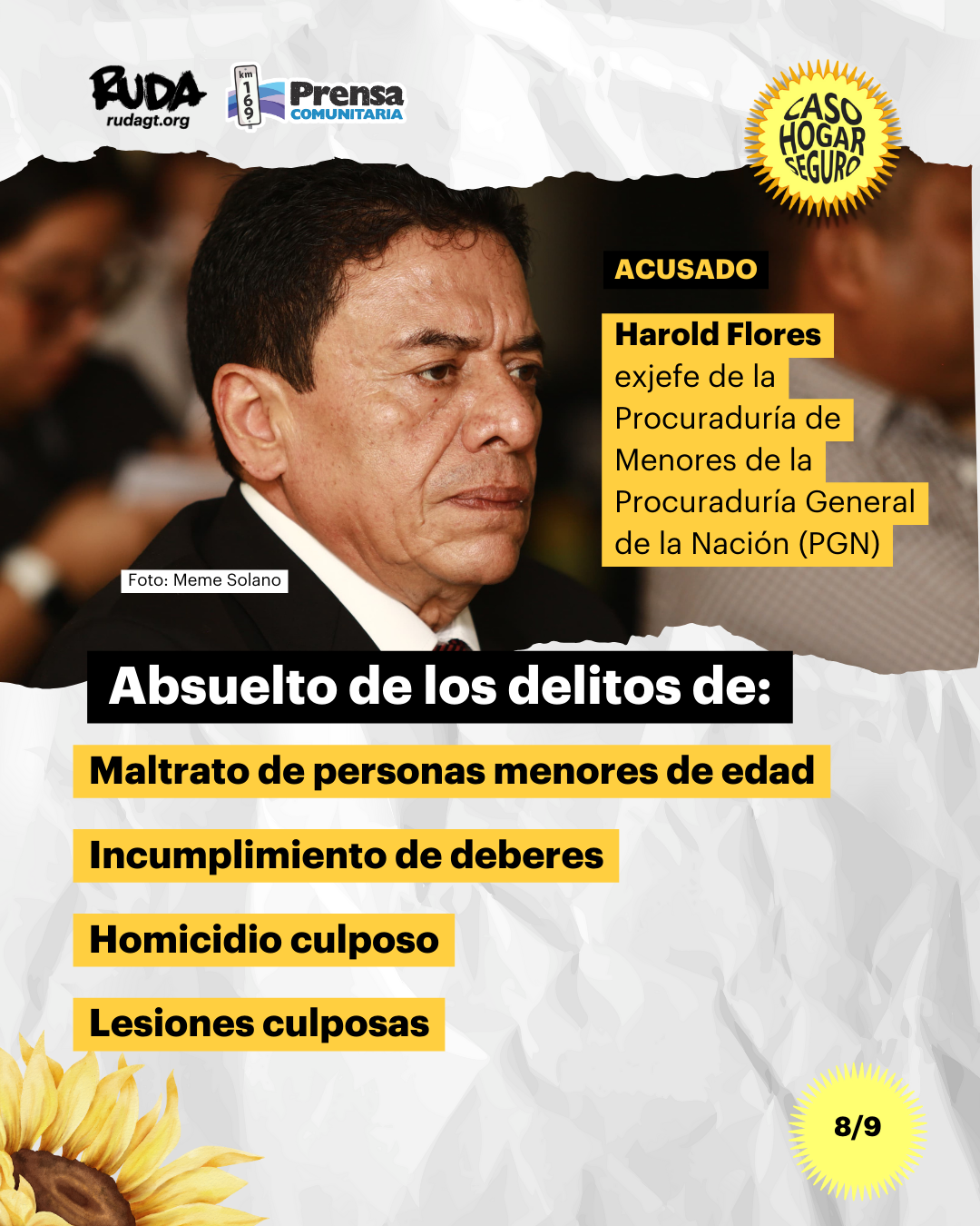 El 12 de agosto de 2025, el Tribunal Séptimo de Sentencia Penal, presidido por la jueza Ingrid Cifuentes, fijó las sentencias para 6 de los 7 acusados y acusadas. Harold Flores fue el único absuelto por falta de pruebas y las sentencias impuestas para cada uno de los y las responsables fueron: