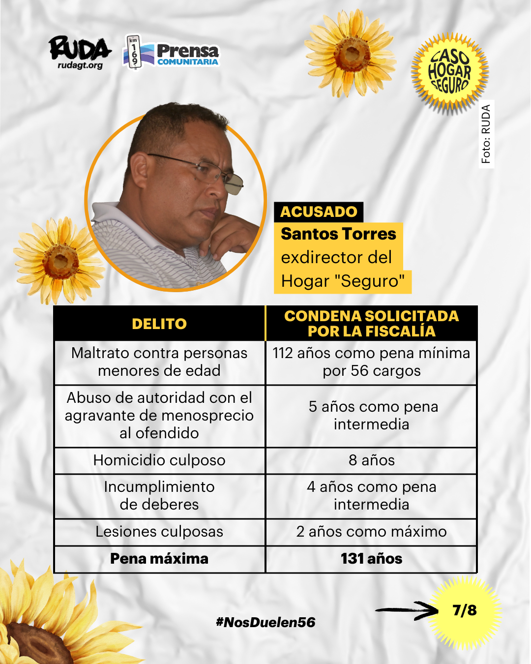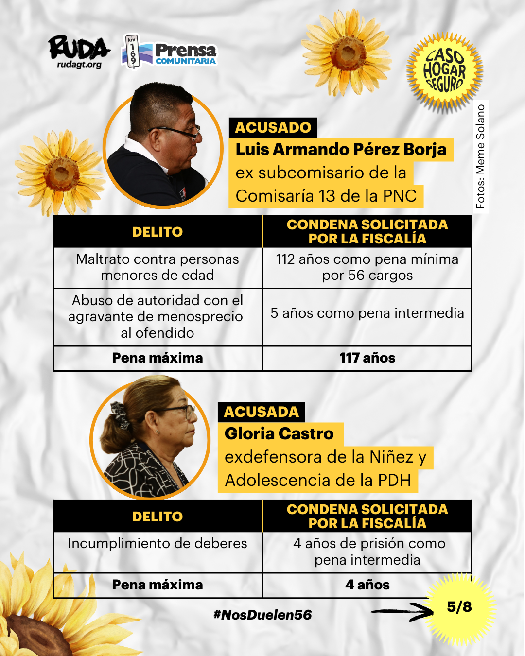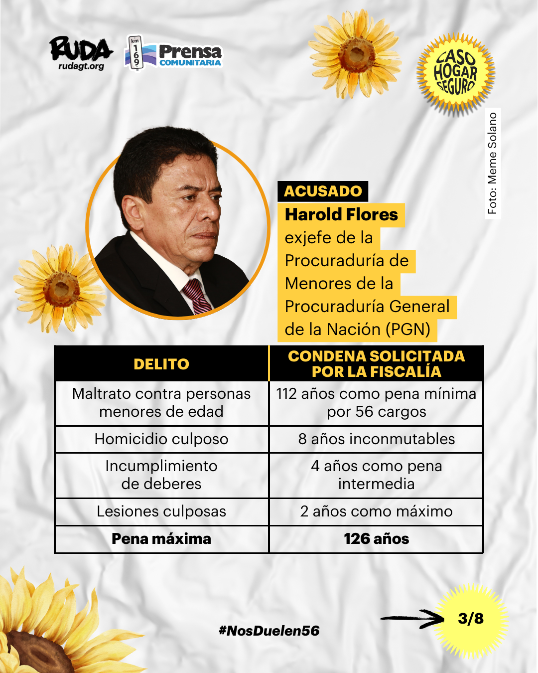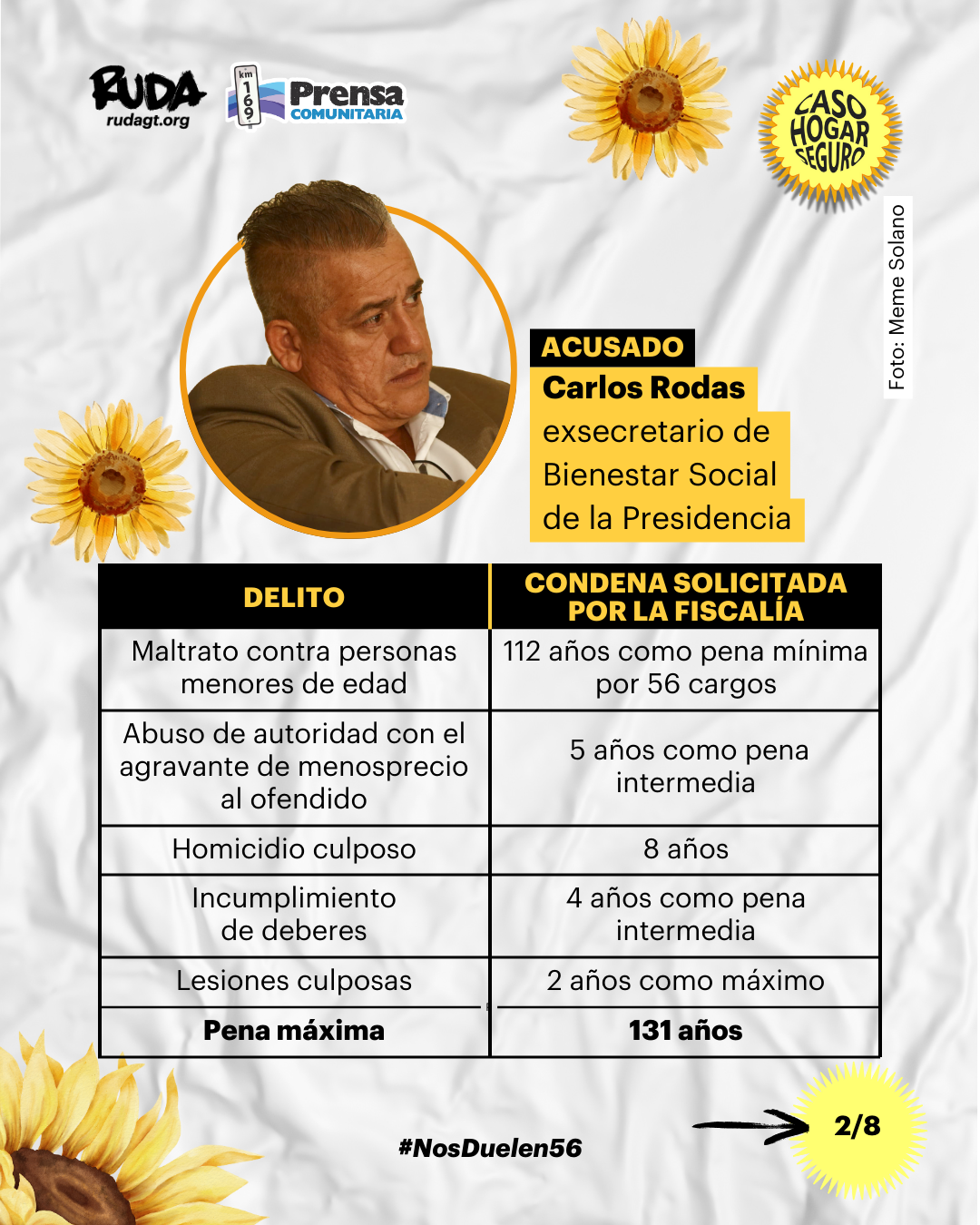 Por ejemplo, para Carlos Rodas, el exsecretario de Bienestar Social de la Presidencia, se solicitó homicidio culposo con el agravante de menosprecio al ofendido y facilidad de prever: 8 años inconmutables. Al recibir una sentencia inconmutable, las y los acusados no pueden solicitar sustituir las penas por otras menos graves o con el pago de fianza.