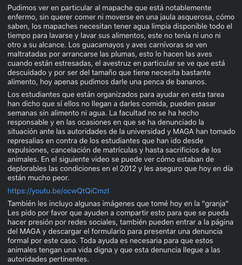 – Queremos ver a parte de los animales de la granja a estos animales silvestres y ver bien la situación e ir a la unidad de bienestar animal para ver cómo se puede atender esto. Porque también vi el video de la publicación de hace 5 años y parece que desde antes se ha dificultado la alimentación, entonces ahora suponemos que ha de estar más complicado. Entonces para ver cómo pueden ellos mejorar esa parte porque quiera que no, como no está el apoyo de los estudiantes hay que ver cómo lo están haciendo ahorita.