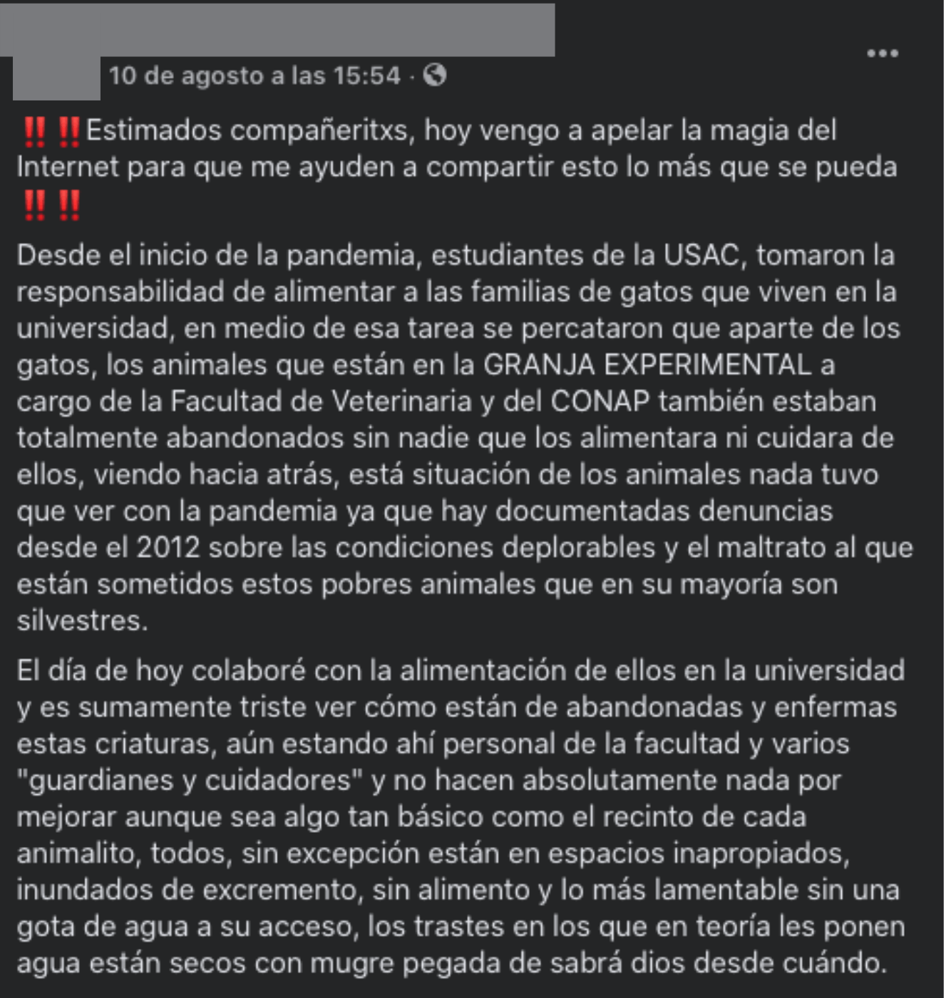 Sin embargo, en el trabajo por alimentar a los gatos, se encontraron con otra situación en la Granja Experimental de la Facultad de Medicina Veterinaria y Zootecnia, específicamente en el área donde están ubicados los animales silvestres, notaron un cierto abandono, falta de alimento, agua e higiene.