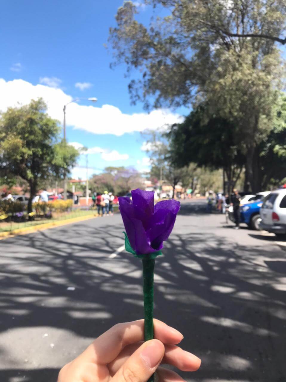 Entre listones morados y amarillos, pancartas con mensajes de justicia y la fotografía de Luz María, van entregando flores moradas de papel a las personas que acompañan la caminata. Al frente está Ada Morales, la madre de Luz, cantando el nombre de su hija, en la ya emblemática “Canción sin Miedo”, que ahora versa soy Sharon, Hillary y Luz María, soy Cristina, Isabel, y soy Claudina.”