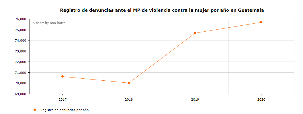 En el departamento de Guatemala la tasa de denuncias de violencia contra las mujeres en promedio anual, considerando el período 2017-2020 ha sido de 912 denuncias por cada 100 mil mujeres, y a nivel nacional este dato es de 947. Esto indica que en los últimos 4 años, por cada 100mil mujeres en el país se han registrado en el MP 947 denuncias por violencia en contra de la mujer.