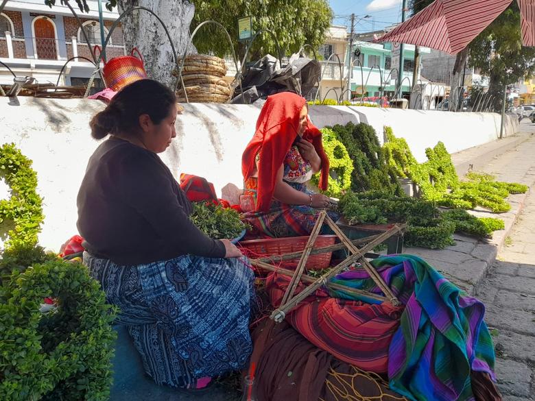 La época, además de ser propicia para estrechar lazos familiares, es una oportunidad para adornar las tumbas de los seres queridos, por eso Carmen y Josefa Méndez, originarias de Totonicapán, ocuparon desde el 29 de octubre un espacio en el mercado cantonal de El Calvario, ahí con mucha paciencia elaboran coronas decorativas hechas de una flor llamada Siempre viva.