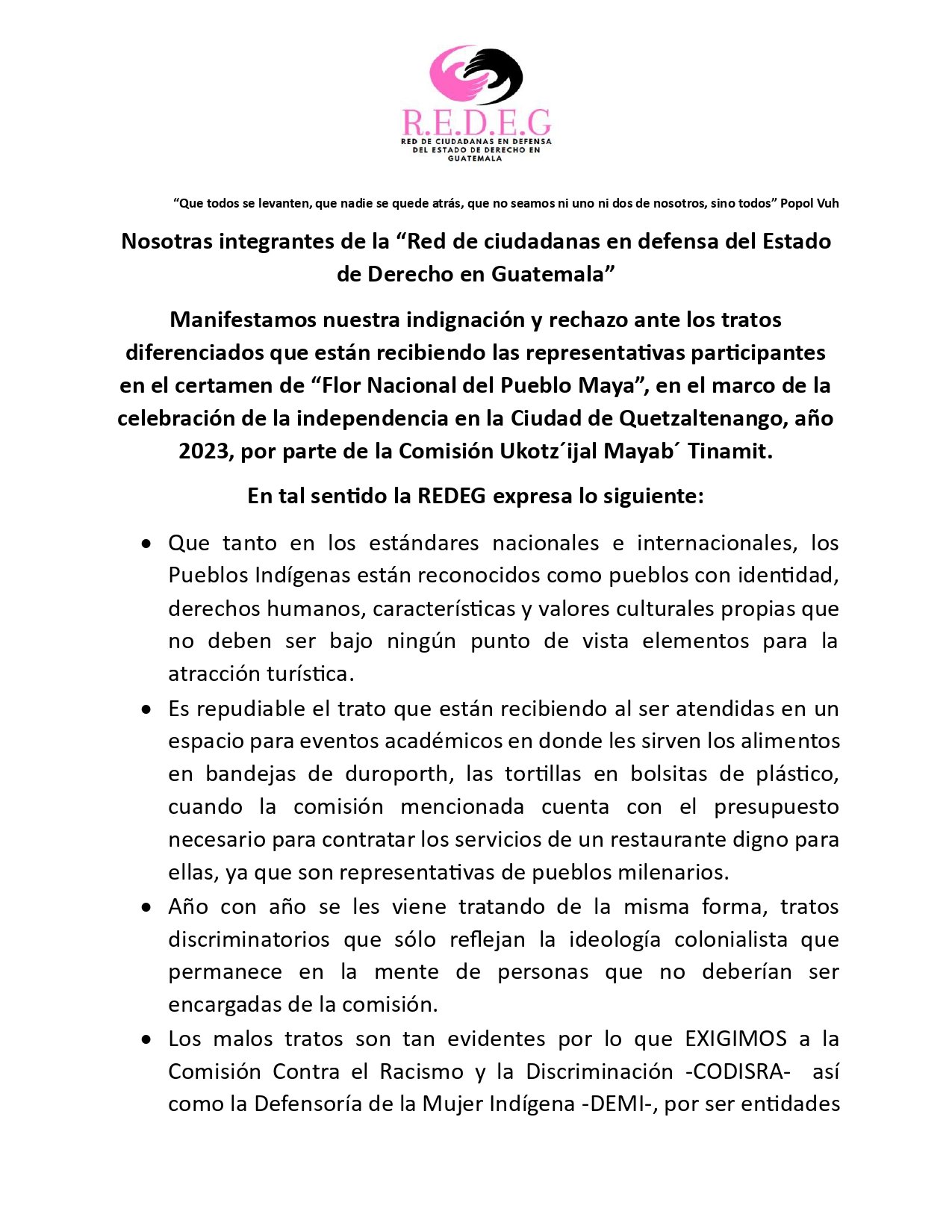 La Red de Ciudadana en defensa del Estado de Derecho en Guatemala (REDEG) expresó su indignación y rechazo a los tratos diferenciados de parte de la Comisión de Ukotz’ijal Mayab’ Tinamit, que organiza el certamen Flor Nacional del Pueblo Maya.