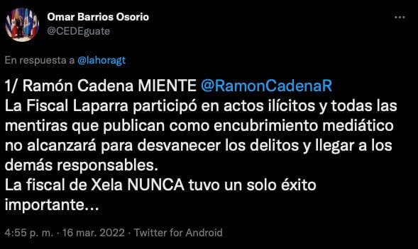 Hasta el momento se desconoce cuáles son los argumentos de Omar Barrios para estar como querellante. Además, el acoso de Castellanos y Barrios se expresa en descalificaciones hacia su trabajo y su título, diciendo que ella “nunca tuvo un éxito importante” como fiscal de la FECI, en contraste con lo que consta en sus evaluaciones de excelente desempeño.