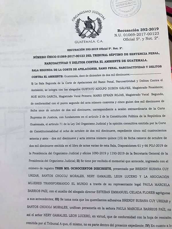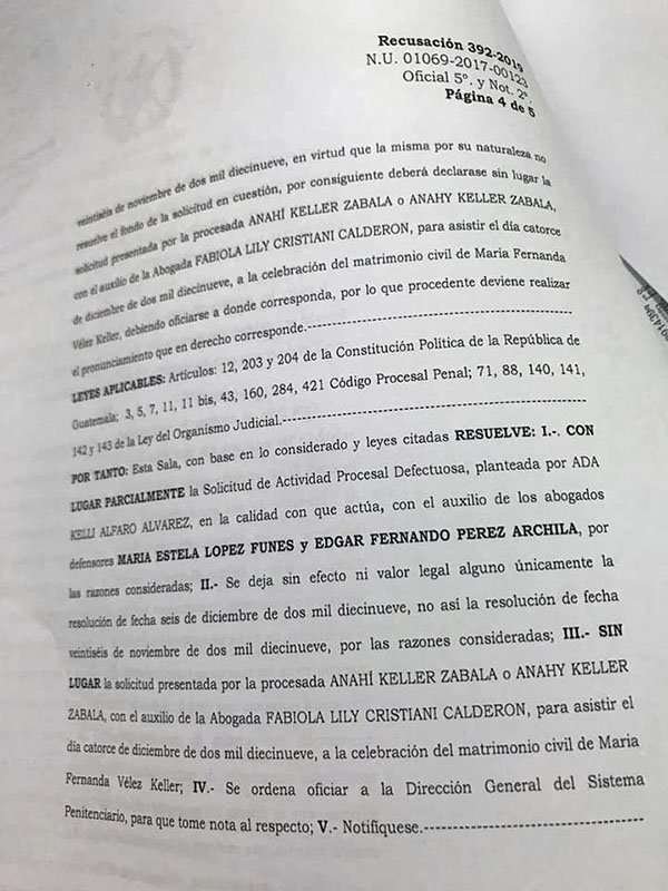 Este es el resultado de la oposición de la Asociación Mujeres Transformando el Mundo y el Bufete de Derechos Humanos, -ambos representantes de víctimas fallecidas y sobrevivientes- a la autorización que la sala ya había otorgado a la abogada de Keller para que pudiese asistir a dicha boda el día de mañana 14 de diciembre.