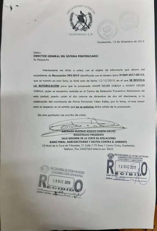 La Segunda Sala de la Corte de Apelaciones ha notificado a todas las partes involucradas en el #CasoHogarSeguro la revocatoria del permiso que se le había otorgado a la ex subsecretaria de la Secretaría de Bienestar Social Anahí Keller Zabala, para salir este sábado de la cárcel Matamoros a la boda de su hija María Fernanda Vélez Keller.